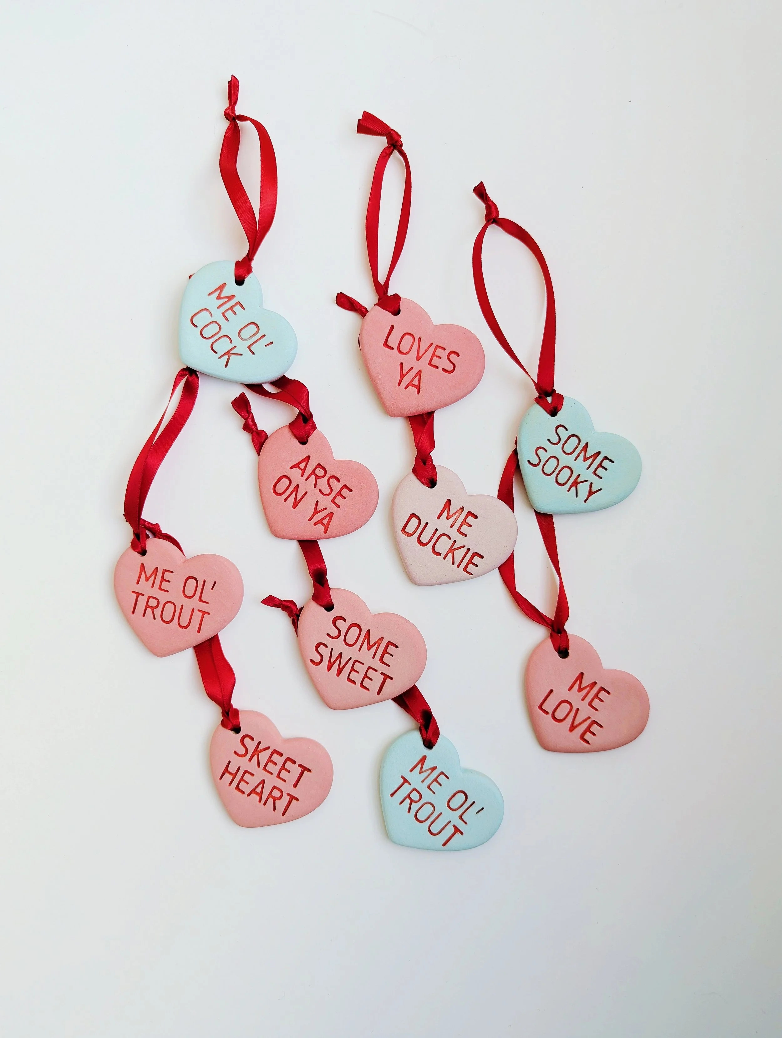 Ceramic hearts, polished to a velvet finish with your favourite Newfoundland terms of endearment.